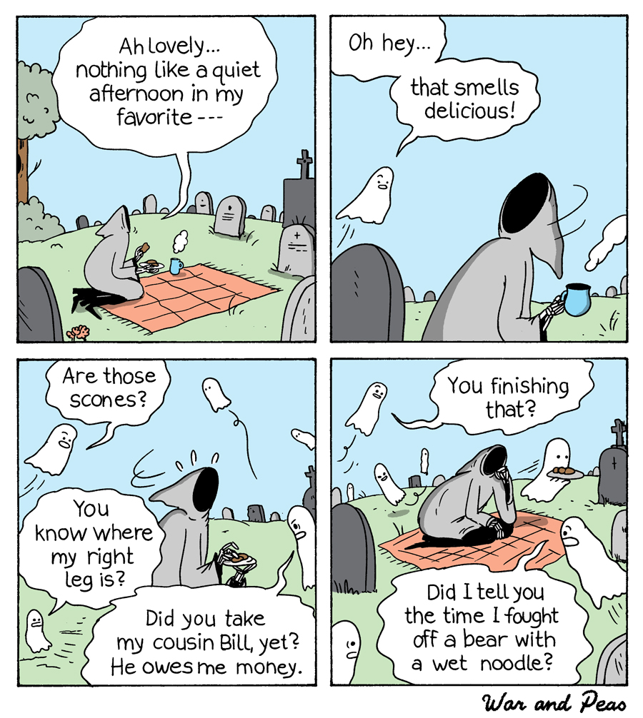 Panel 4: The Grim Reaper, slightly embarrassed or amused, raises his hands defensively and says, “Okay, I like puns. Sue me.” The man remains unaware inside.