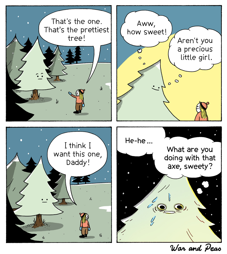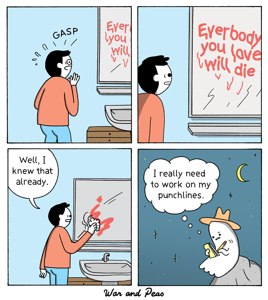 4-panel-Comic by War and Peas: 1. Panel: A person is in a hospital bed while another person is sitting by their side. The person in bed says, "... and then Death flashed before my eyes." 2. Panel: Flashback: The Grim Reaper has spread his coat in front of the person from the bed and shows what he has on underneath like an exhibitionist. 3. Panel: The person says: "This is creepy." 4. Panel: Back to the hospital bed. The other person says, "You are so brave."