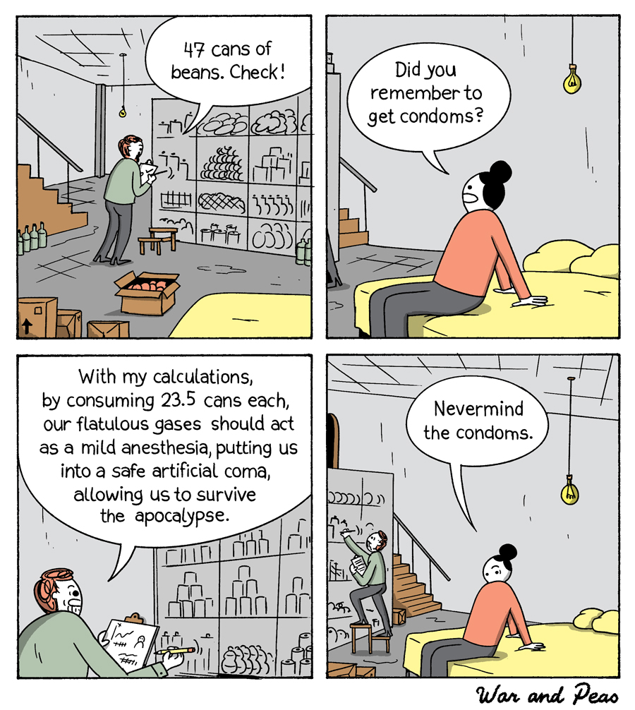 Posted in war and peas and tagged as apocalypse, beans, bunker, comic, comic artist, comic strip, comics, comix, condoms, couple, elizabeth pich, fallout, funny, gas, humour, jonathan kunz, lol, nuclear fallout, romance, war and peas, webcomic.