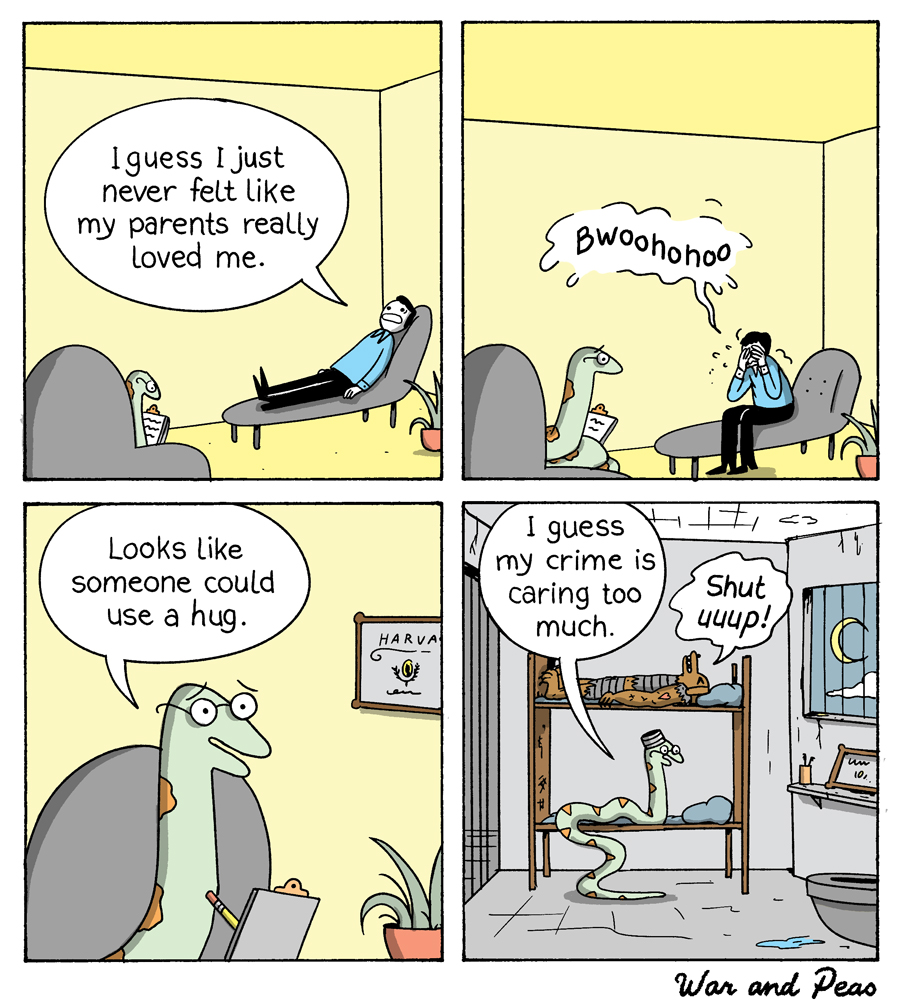 Posted in war and peas and tagged as boa, comic, comic artist, comic strip, comics, comix, crime, doctor, elizabeth pich, funny, hug, humour, jonathan kunz, lol, prison, Snake, therapist, therapy, war and peas, webcomic.