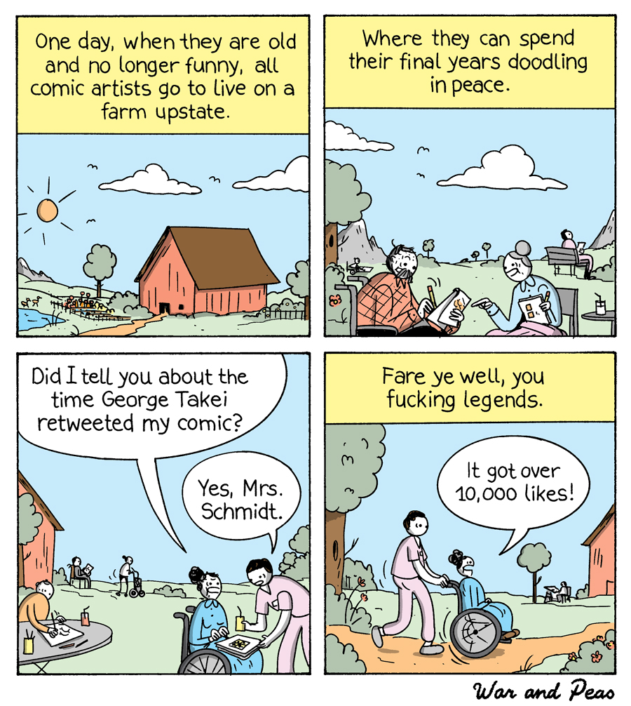 Posted in war and peas and tagged as comic, comic artist, comic strip, comics, comix, doodling, elizabeth pich, farm, funny, george takei, humour, jonathan kunz, lol, old, one day, retirement, war and peas, webcomic.
