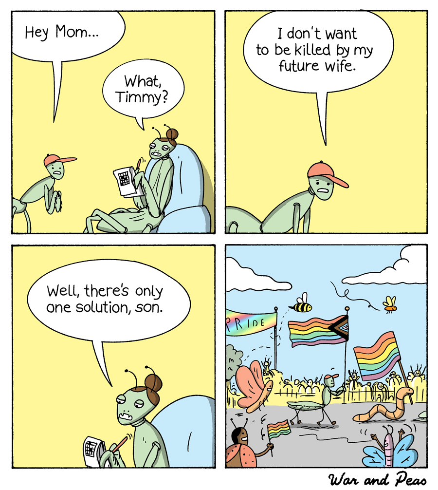 Posted in war and peas and tagged as best of 2021, comic, comic artist, comic strip, comics, comix, elizabeth pich, funny, gay, happy pride, humour, jonathan kunz, lgbtq+, lol, mantis, mom, mother, parade, parents, praying mantis, pride, pride month, timmy, war and peas, webcomic, wholesome.