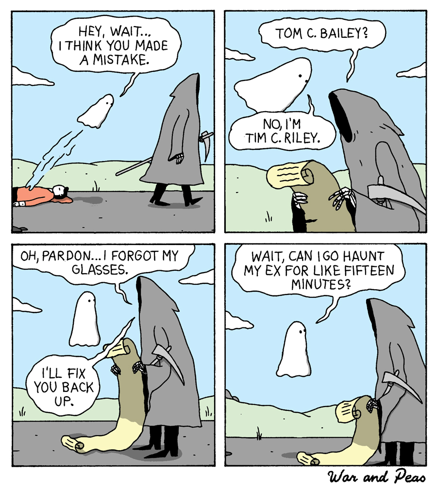 Posted in war and peas and tagged as 4 panel comic, black humor, Cartoon Studies Submission 2018, cartoons, comics, confusion, dark humor, death, elizabeth pich, ex boyfriend, ex girlfriend, four panel comic, funnies, gary the ghost, ghost, ghosts, Grim Reaper, haunt, haunting, humor, jonathan kunz, mistake, sunday comics, war and peas, webcomics, Yonkoma. 1 Comment